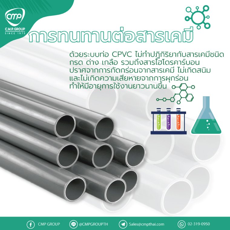 ด้วยระบบท่อ CPVC ไม่ทำปฏิกิริยากับสารเคมีชนิด กรด ด่าง เกลือ รวมถึงสารไฮโดรคาร์บอน