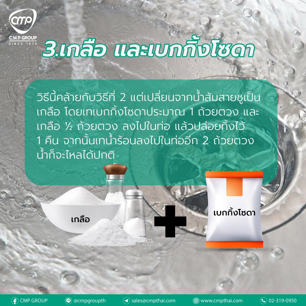 วิธีนี้คล้ายกับวิธีที่ 2 แต่เปลี่ยนจากน้ำส้มสายชูเป็นเกลือ โดยเทเบกกิ้งโซดาประมาณ 1 ถ้วยตวง และเกลือ ½ ถ้วยตวง ลงไปในท่อ แล้วปล่อยทิ้งไว้ 1 คืน จากนั้นเทน้ำร้อนลงไปในท่ออีก 2 ถ้วยตวงน้ำก็จะไหลได้ปกติ
