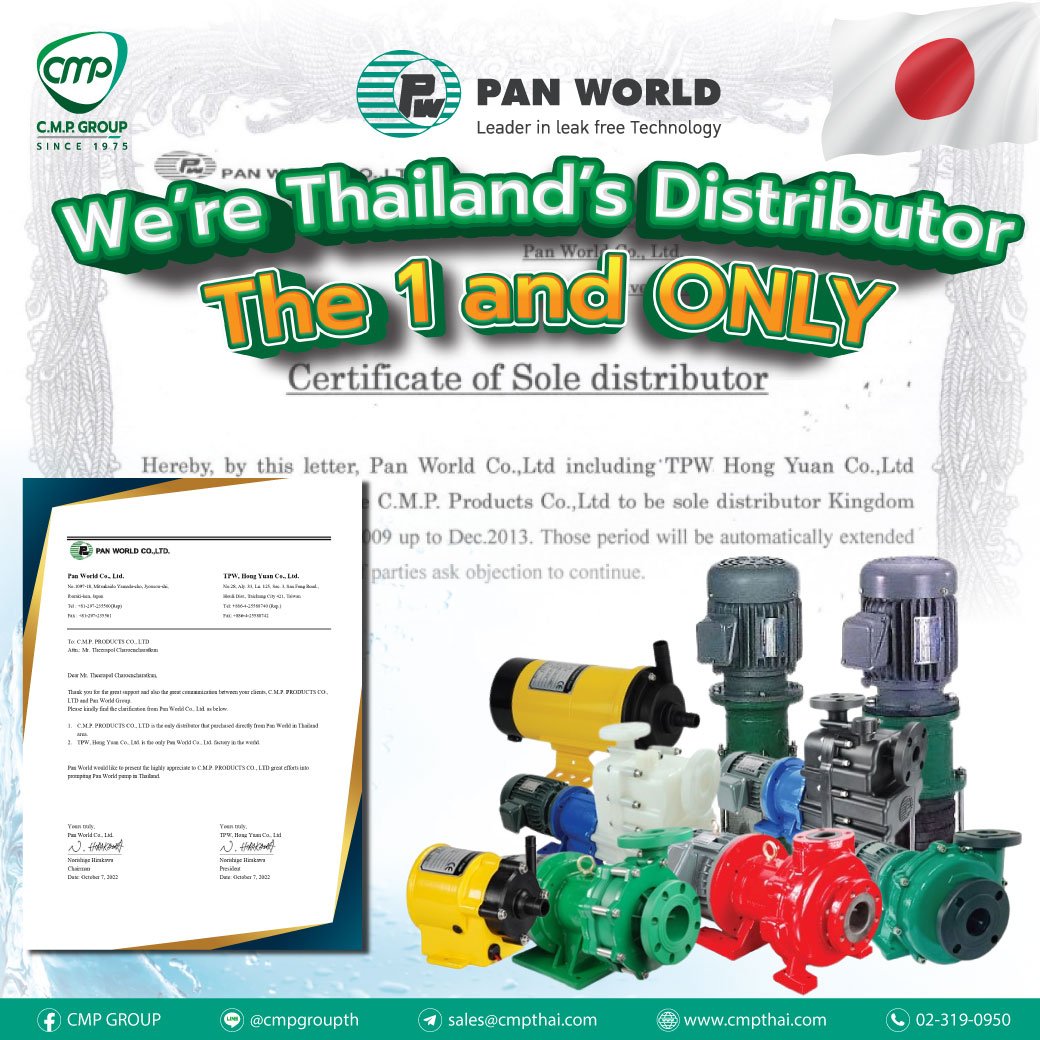 CMP GROUP ได้รับการแต่งตั้งอย่างเป็นทางการจาก “Pan World Co.,Ltd.” ประเทศญี่ปุ่นให้เป็นตัวแทนจำหน่ายแต่เพียงผู้เดียวในประเทศไทยตั้งแต่ปี 2009 ภายใต้แบรนด์ “PANWORLD” Sealless Magnetic Drive Pump สำหรับงานทางเคมี ที่มีประสบการณ์มามากกว่า 26 ปีในการผลิตด้วยเทคโนโลยีของประเทศญี่ปุ่น มีวัสดุที่หลากหลายสำหรับสารเคมีต่างๆ และครอบคลุมการใช้งานไปจนถึง 1,500 ลิตร/นาที ตัดปัญหาการรั่วไหลของซีล ด้วยรูปแบบการทำงานจากคลื่นแม่เหล็กเหนี่ยวนำมาทดแทนชุดซีล เหมาะสำหรับงานอุตสาหกรรมต่างๆ