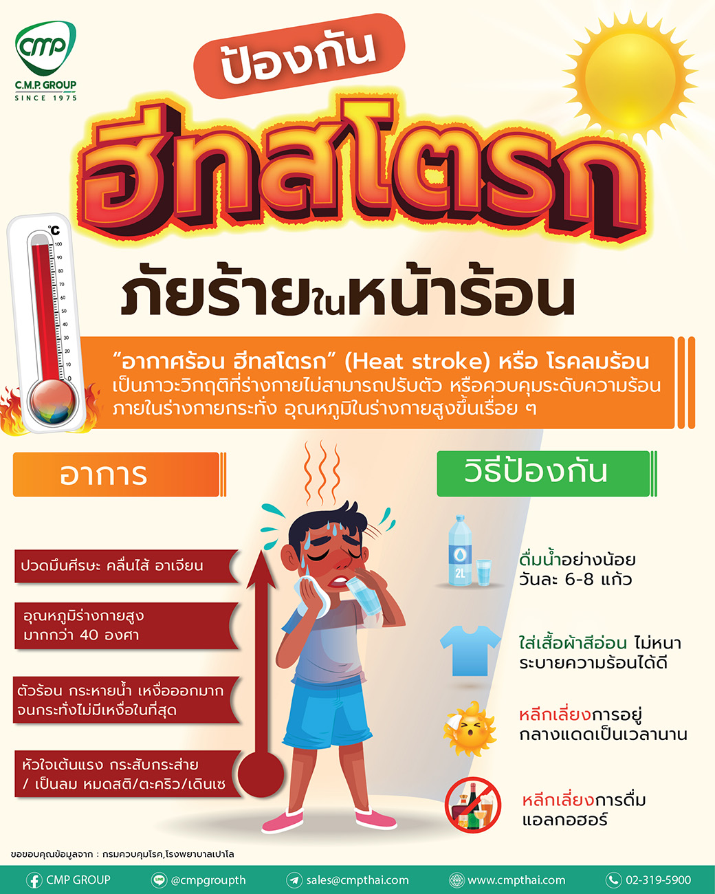 ก้าวเข้าสู่หน้าร้อนอย่างเต็มตัว สิ่งที่ต้องระวังอย่างมากคงไม่พ้นเรื่องสุขภาพโดยเฉพาะเรื่องของอุณหภูมิที่ร้อนจัด จนสามารถทำให้เกิดเป็นภาวะ...โรคฮีทสโตรก หรือ ลมแดด คือ การที่ร่างกายได้รับความร้อนมากเกินไป จนทำให้ความร้อนในร่างกายสูงกว่า 40 องศาเซลเซียส ซึ่งส่งผลต่อระบบไหลเวียนโลหิตและระบบสมอง กลุ่มเสี่ยงโรคฮีทสโตรกก็จะมี ผู้สูงอายุ, หญิงตั้งครรภ์ และเด็กเล็ก ที่ร่างกายปรับตัวไม่ทัน