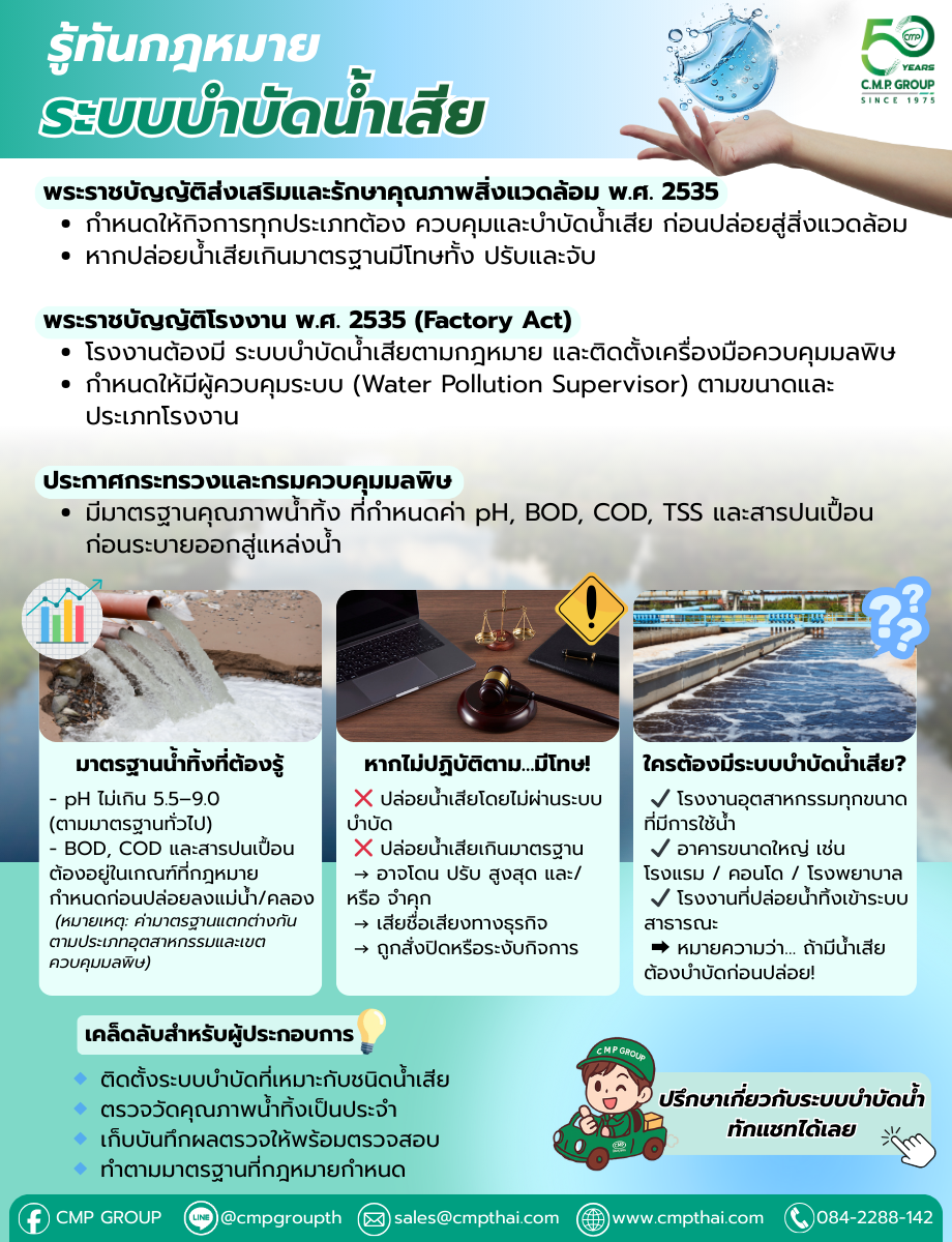 การจัดการน้ำเสียไม่ใช่เรื่องเลือกทำ — แต่เป็น ภาระผูกพันตามกฎหมายและความรับผิดชอบต่อสังคม ผู้ประกอบการที่ดูแลระบบบำบัดอย่างถูกต้องจะช่วยลดผลกระทบต่อสิ่งแวดล้อม สนับสนุนการใช้ทรัพยากรน้ำอย่างยั่งยืน และยังช่วยลดความเสี่ยงด้านกฎหมายด้วย